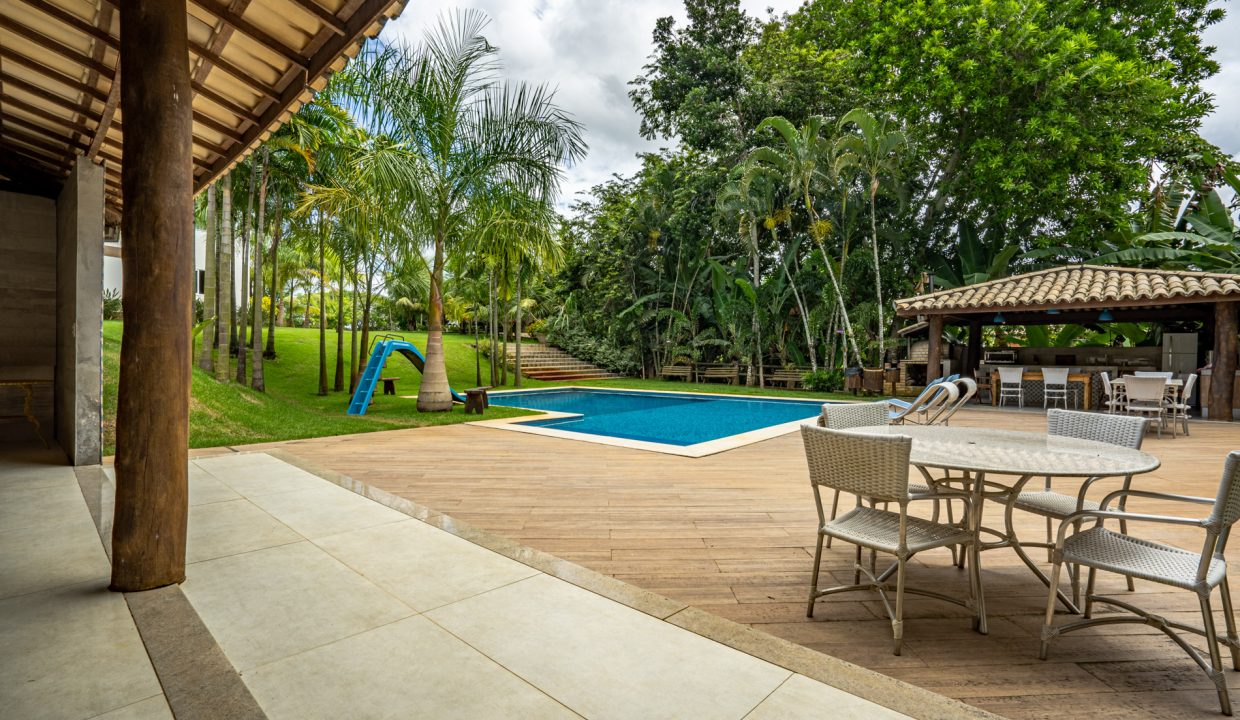 Espaço gourmet com forno de pizza, churrasqueira, bancada em granito com armários embutidos, piscina em dois níveis com prainha e vista para lagoa, deck com piso imitando madeira, garagem para 6 carros cobertos e estacionamento.